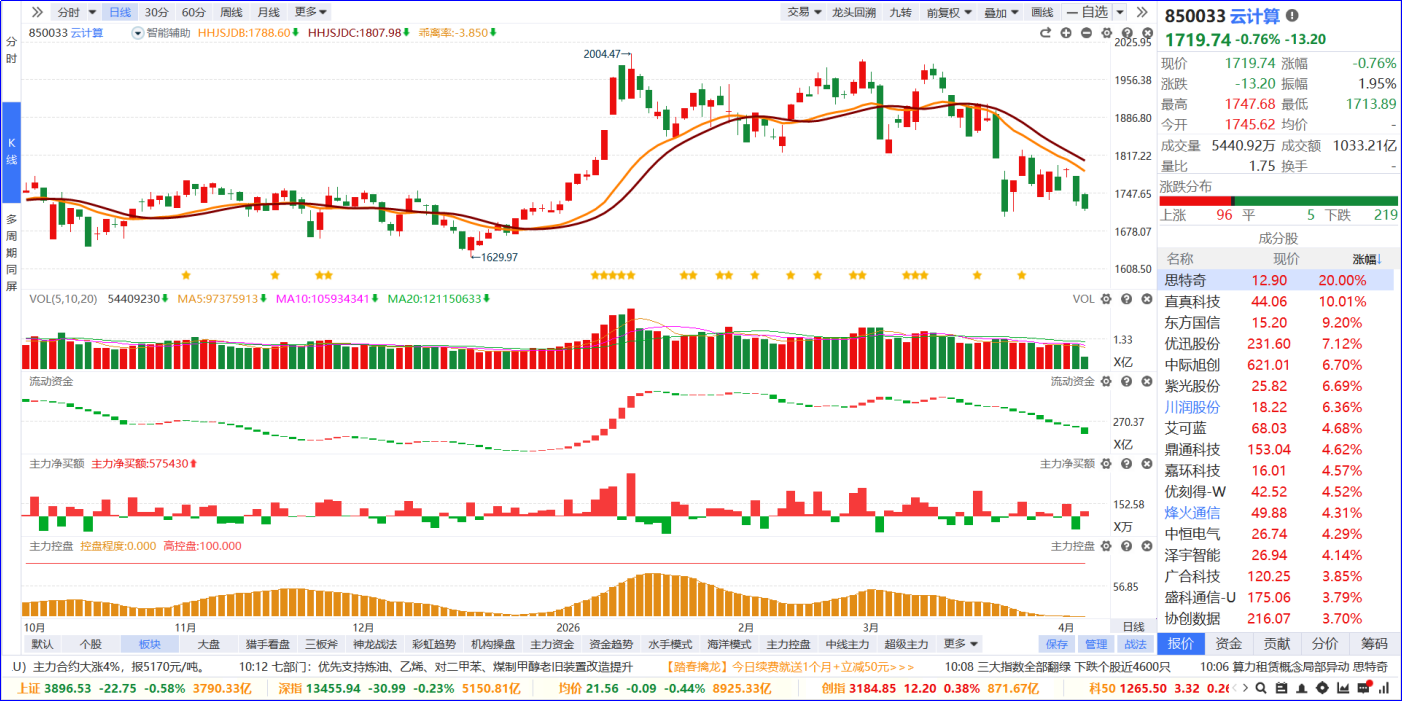 从软件信号看,云计算板块近期流动资金持续翻绿,主力净买额红绿柱基本持平。从炒作逻辑看,核心是工信部“算力银行”“算力超市”政策落地,盘活闲置算力资源,加速算力市场化流通,叠加AI算力需求持续爆发,云计算行业迎来商业模式升级与需求增长双驱动。从K线走势看,板块高位震荡磨底,今日小幅调整,板块内涨跌分化,算力租赁标的领涨。后续可以聚焦板块内部5日主力排序靠前,优选流动资金持续翻红的个股跟踪。