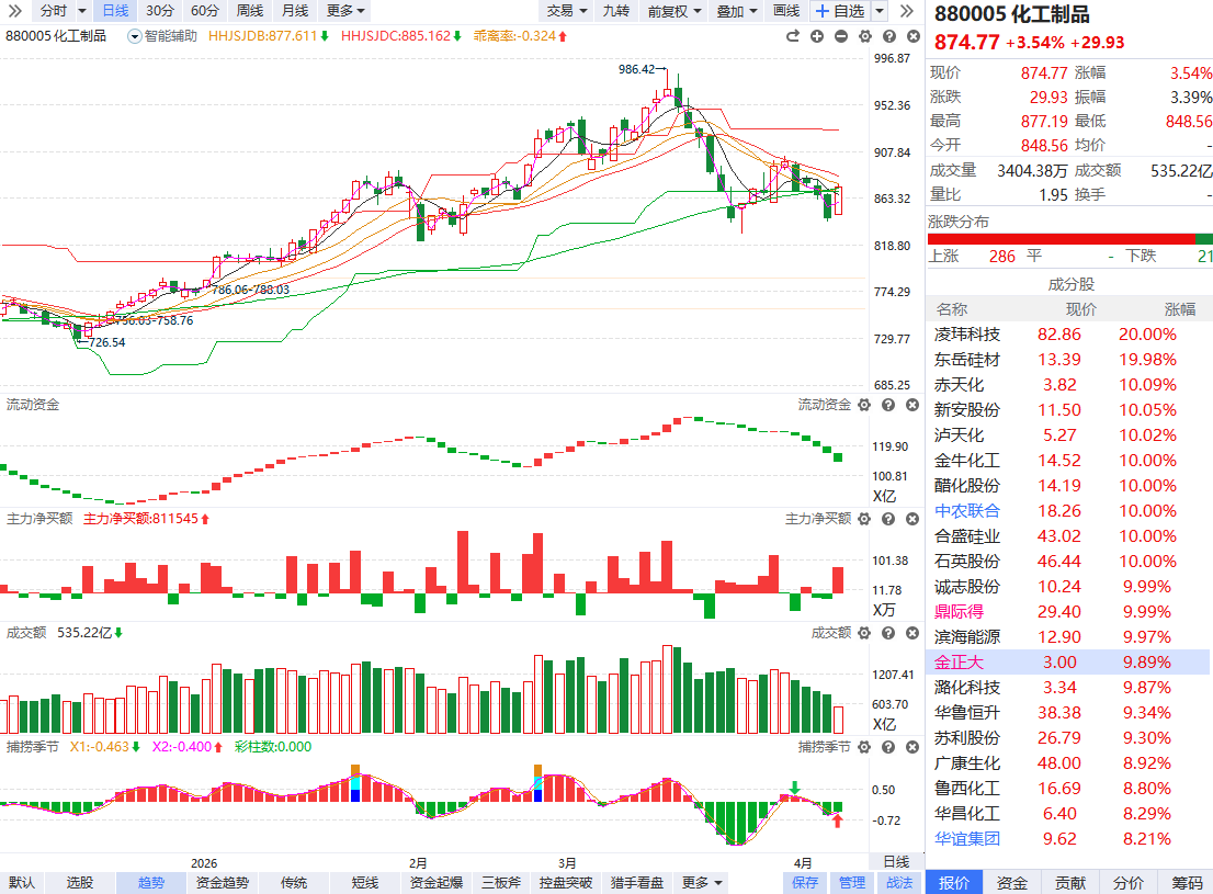 根据软件信号,板块近期流动资金持续翻绿,主力净买额红肥绿瘦,目前已经在辅助线下方走出W底修复结构,如能出现捕捞季节底背离金叉站上辅助线且资金开始翻红,则有望形成趋势拐点,耐心等待资金和趋势转强信号。
