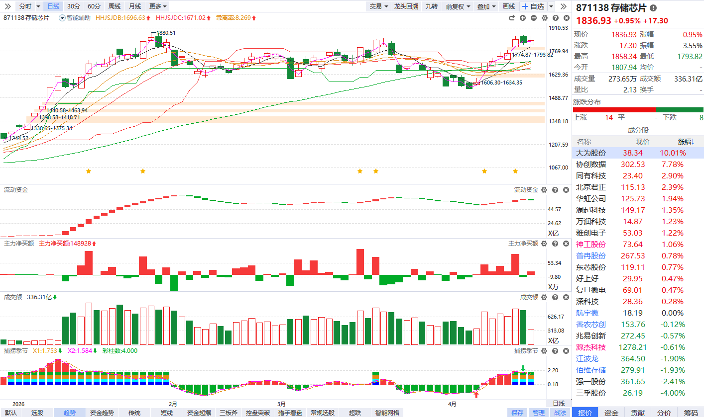 根据软件信号,板块近期流动资金持续翻红,主力净买额红肥绿瘦,目前反弹到前期平台高点附近的压力位,短期在平台压力附近震荡消化套牢筹码,后续首次回档如能走出资金翻红+熊线上移的反弹,有望形成新一轮上行趋势。