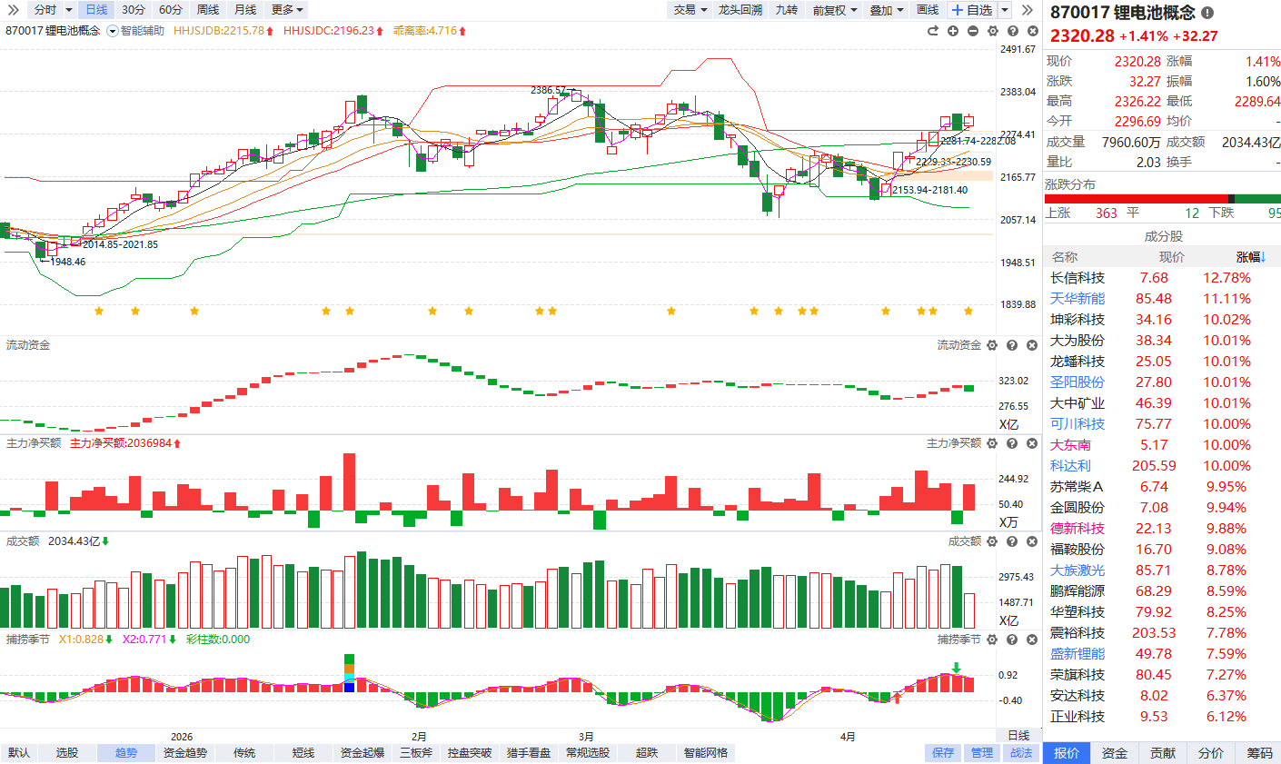 市场早盘震荡拉升,深成指、创业板指均涨超1%。创业板指黄白线分化明显,权重股表现较强。成交量方面,量能有所萎缩,第一个小时两市缩量1126亿元,预计全天成交超2.2万亿。市场情绪快速回暖,当前上涨个股超3600家,封板率近八成。板块方面,热点快速轮动,电池产业链集体爆发,权重宁德时代盘中连续反超中国石油、工商银行跃居A股总市值第二。算力租赁概念反复活跃,宏景科技涨超15%续创历史新高,美利云、奥瑞德封涨停。
