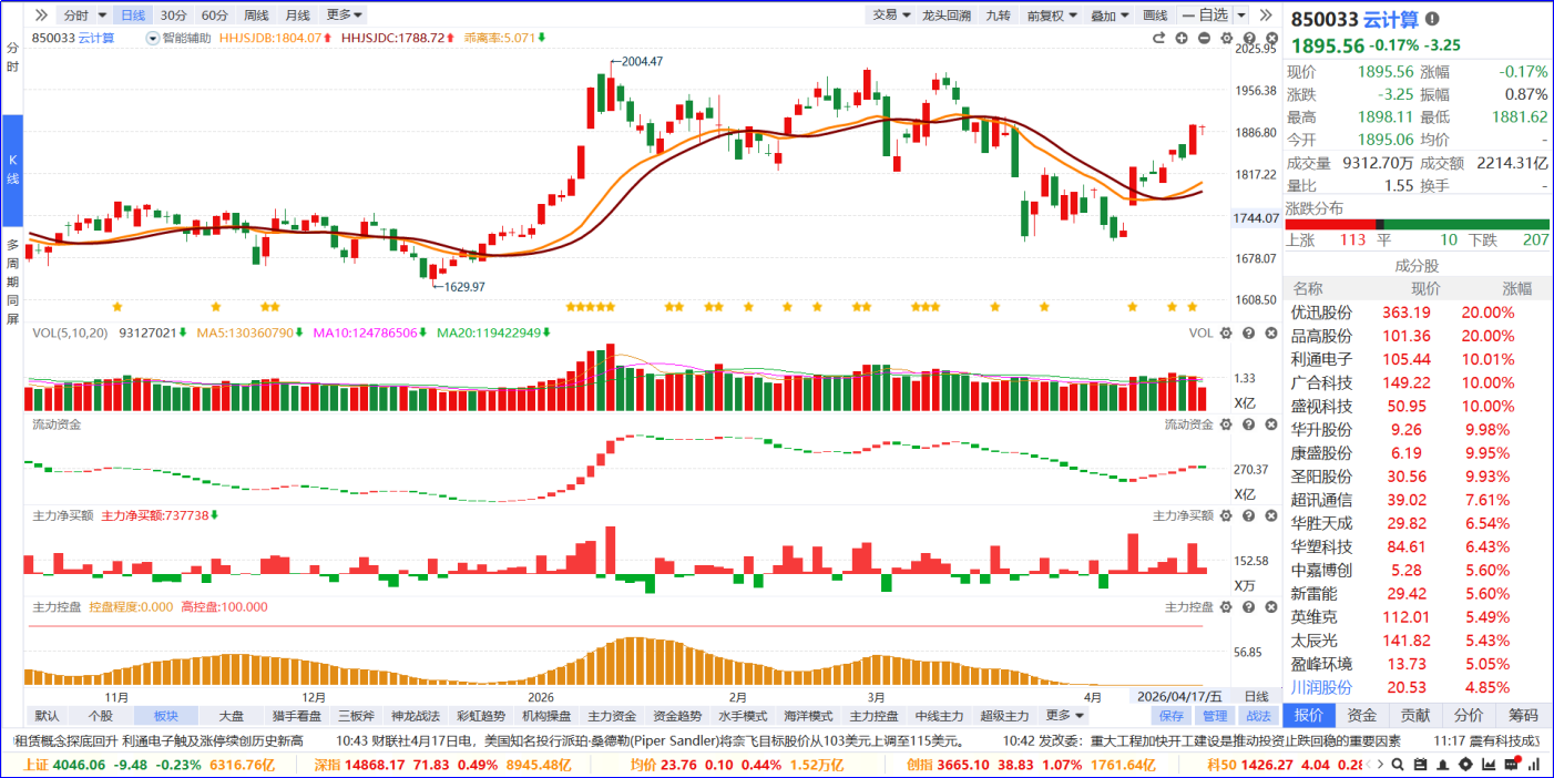 从软件信号看,云计算板块流动资金持续翻红,主力净买额红肥绿瘦。从炒作逻辑看,核心是我国AI日均Token调用量突破140万亿,较上年末增长超40%,验证AI商业化规模化应用进入爆发期,带动算力基础设施需求放量,板块迎来业绩与需求双驱动。从K线走势看,板块高位震荡修复,今日小幅调整,算力标的领涨;内部个股涨跌分化明显,涨停家数居市场前列。后续可聚焦板块内部5日主力排序靠前,优选流动资金持续翻红的个股跟踪。
