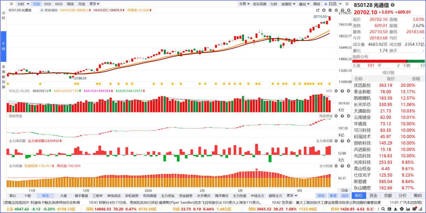 从软件信号看,光通信板块近期流动资金持续翻红,主力净买额红肥绿瘦,主力控盘呈现高度控盘。从炒作逻辑看,核心是中际旭创一季度业绩暴增,营收与净利润同比均翻倍增长,验证光通信行业高景气,叠加AI算力需求持续爆发与CPO技术迭代,板块迎来业绩与需求的双重驱动。从K线走势看,板块整体处于上升趋势,今日量价强势齐升创阶段新高;内部个股普涨,涨停家数居市场第一位。后续可重点关注两类个股:一是5日主力资金排序靠前、处于低位且流动资金持续翻红的标的;二是处于相对高位,但筹码控盘程度持续递增的个股。