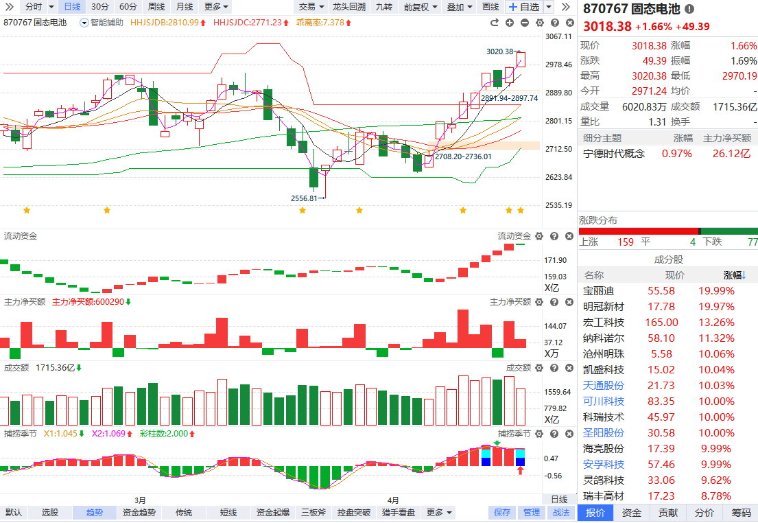 消息面上,中航证券研报指出,钠电+固态体系产业化渐行渐近,关注材料+设备端增量机遇。固态电池方面,锂电下游应用的多元化趋势固态电池产业化节奏提高要求,产业化趋势明确。