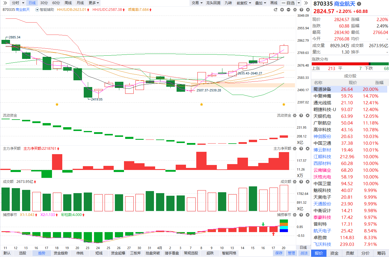 午后商业航天概念涨势扩大,江顺科技2连板,续创历史新高,中国卫通、天奥电子涨停,此前中国卫星、有研复材、西部材料、起帆电缆等多股涨停。