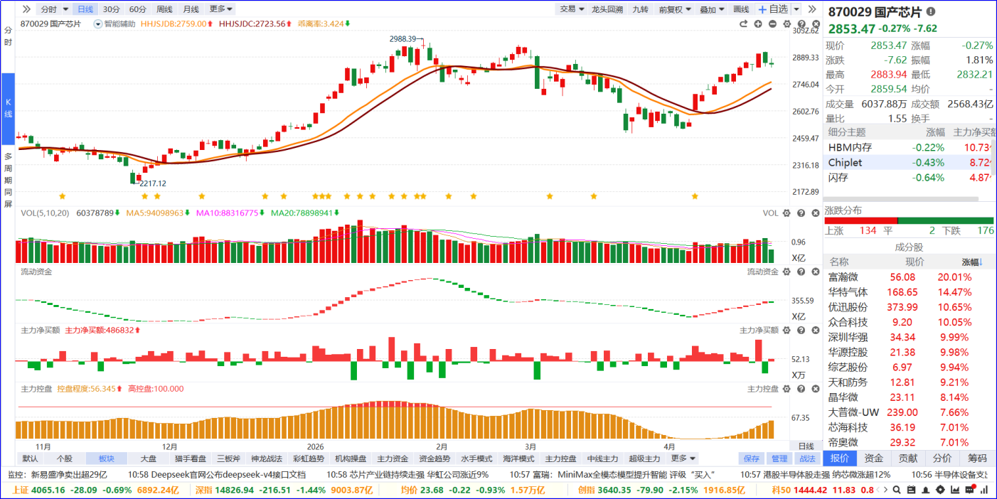 从软件信号看,国产芯片板块流动资金持续翻红,主力净买额红肥绿瘦。从炒作逻辑看,德州仪器业绩指引超预期,带动全球半导体行业景气度回暖,叠加国产替代加速,板块迎来业绩与估值双重修复。从K线走势看,板块处于高位回调后的二次修复阶段,依托均线支撑震荡上行,趋势向好,细分赛道轮动活跃;内部个股涨跌分化明显,涨停家数居市场前列。后续可聚焦板块内部5日主力排序靠前,优选流动资金持续翻红的个股跟踪。