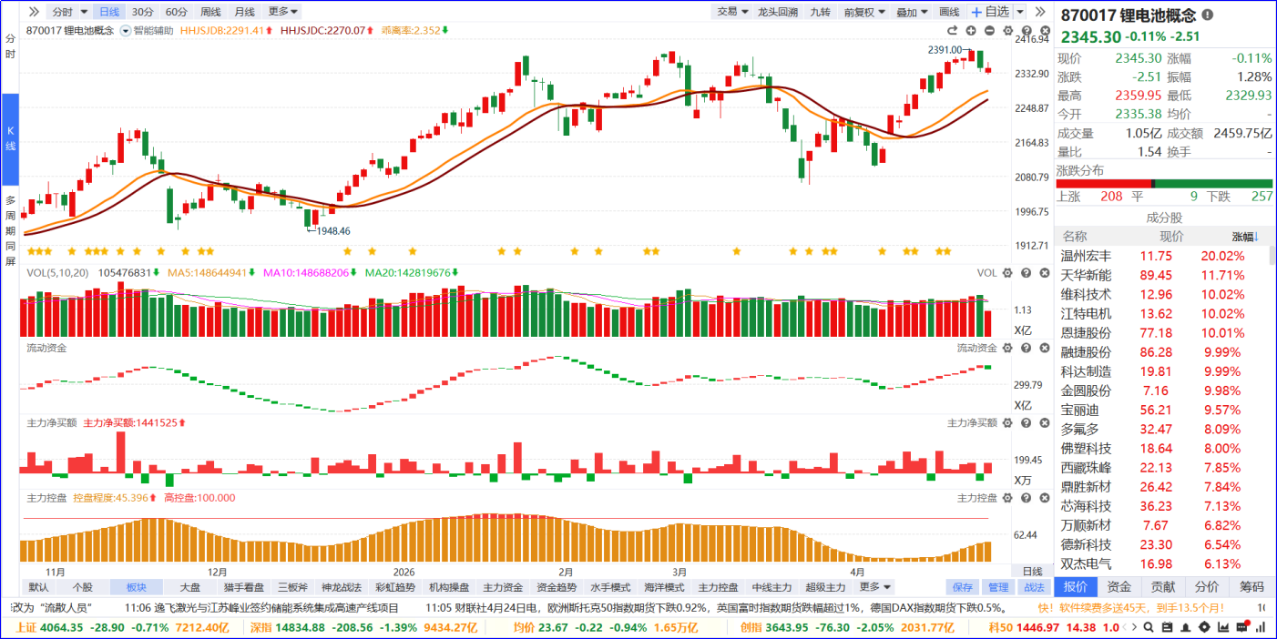 从软件信号看,锂电池板块近期流动资金持续翻红,主力净买额红肥绿瘦。从炒作逻辑看,碳酸锂价格持续反弹,带动全产业链盈利修复。从K线走势看,板块整体依托均线支撑横盘震荡,资金聚焦上游锂矿与锂电材料标的;内部个股涨跌各半,涨停家数居市场第一位。后续可聚焦板块内部5日主力排序靠前,优选流动资金持续翻红的个股跟踪,后续可逢低布局受益于锂价上涨的核心龙头。
