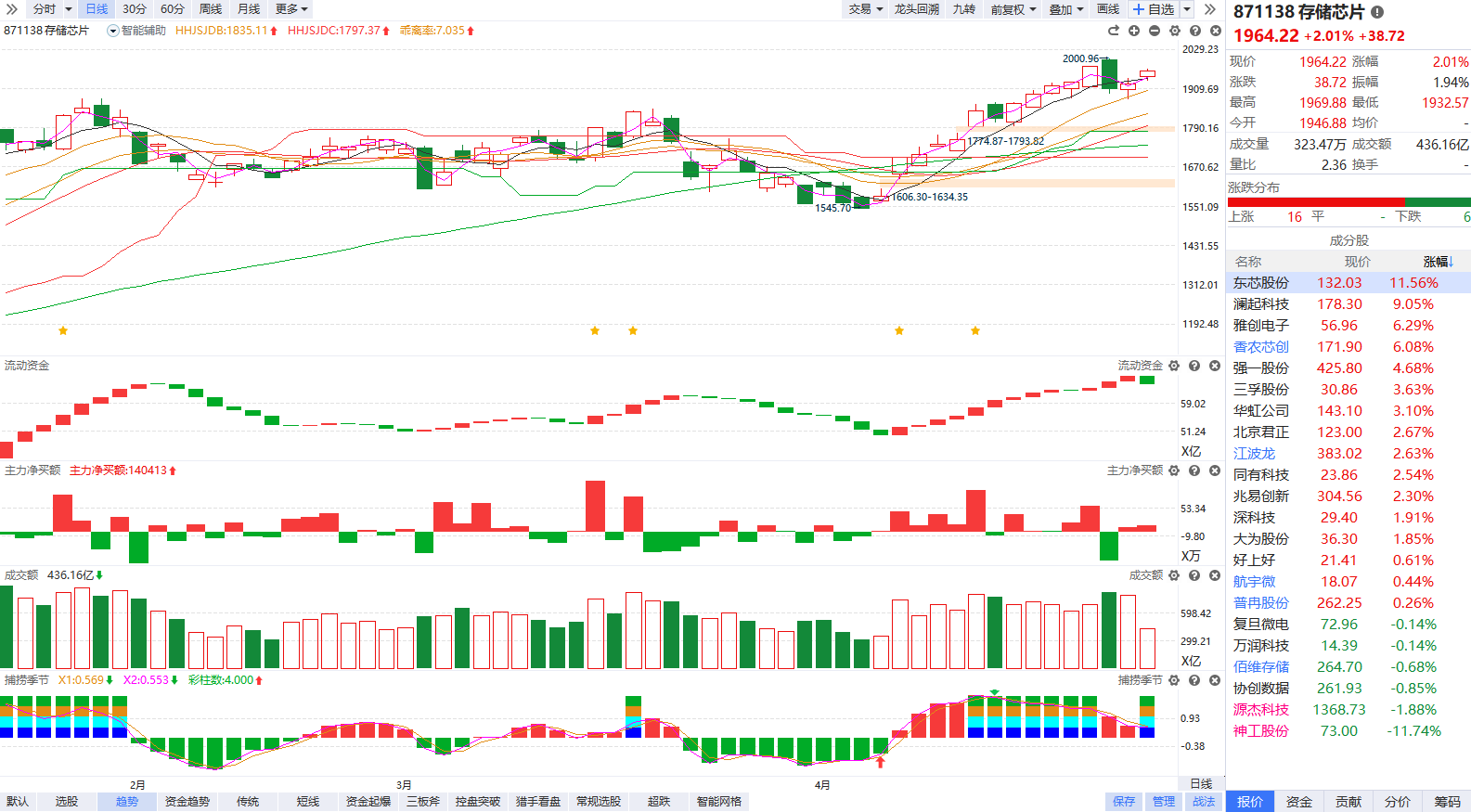 根据软件信号,板块近期流动资金持续翻红,主力净买额红肥绿瘦,目前温和放量站上辅助线,首次缩量回档如能走出熊线上移+资金翻红的回档金叉,有望形成新一轮趋势启动。