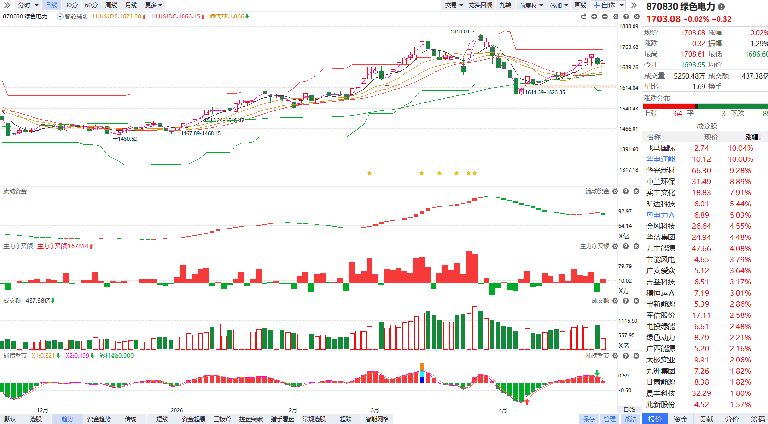 根据软件信号,板块近期流动资金持续翻红,主力净买额红肥绿瘦,目前熊线走平为箱体震荡预期,震荡期反弹到平台压力附近容易承压分化,注意回避冲高追涨,耐心等待熊线走平洗盘1-2周后再次上移的新一轮趋势启动。