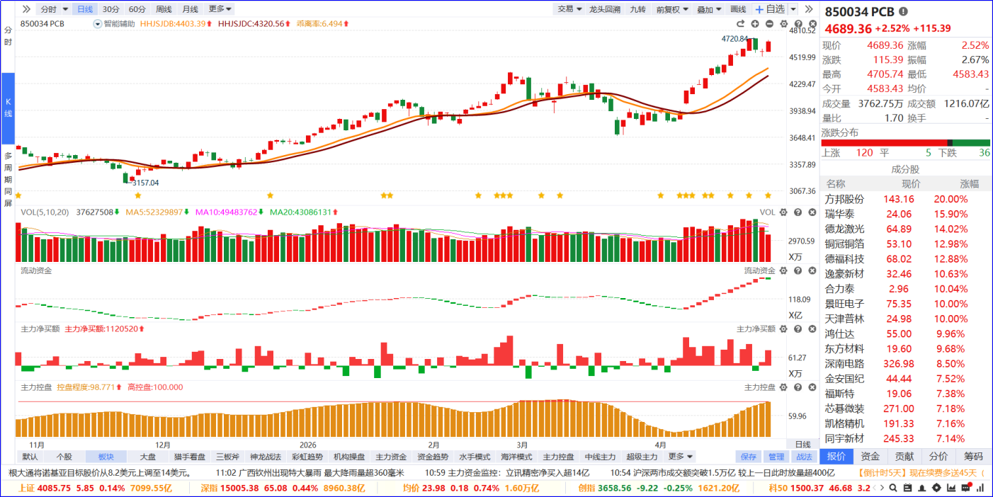 从软件信号看,PCB板块流动资金持续翻红,主力净买额红肥绿瘦,主力控盘度递增。从炒作逻辑看,上游材料厂商集体涨价,直接锁定AI服务器、交换机等高阶应用,行业迎来量价齐升的盈利拐点。叠加AI算力硬件需求爆发,高阶PCB供不应求,板块业绩弹性最大化窗口开启。从K线走势看,板块处于主升浪阶段,均线呈多头排列,成交量温和放大,量价配合健康,板块内个股普涨。后续可聚焦板块内部5日主力排序靠前、优选流动资金持续翻红、主力控盘度递增的个股跟踪。
