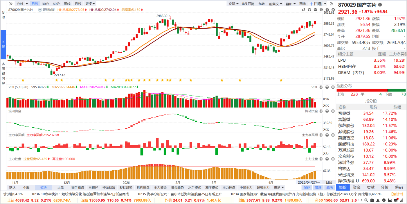 从软件信号看,国产芯片板块近期流动资金持续翻红,主力净买额红肥绿瘦。从炒作逻辑看,美股英特尔股价上周五大涨超27%,创26年新高,核心催化是智能体AI时代 CPU/GPU 配比提升,CPU需求大幅增长,供需缺口扩大A股算力芯片情绪;叠加海外半导体行业景气度触底回升、国产替代加速推进,板块迎来业绩与估值双重修复窗口。从K线走势看,板块处于高位回调后的二次上升阶段,逼近前期高点,成交量温和放大,量价配合健康;内部个股涨跌分化,涨停家数居市场前列,资金聚焦CPU、HBM存储等核心赛道。后续可关注核心标的回踩均线的低吸机会,同时需控制仓位,警惕高位波动风险。