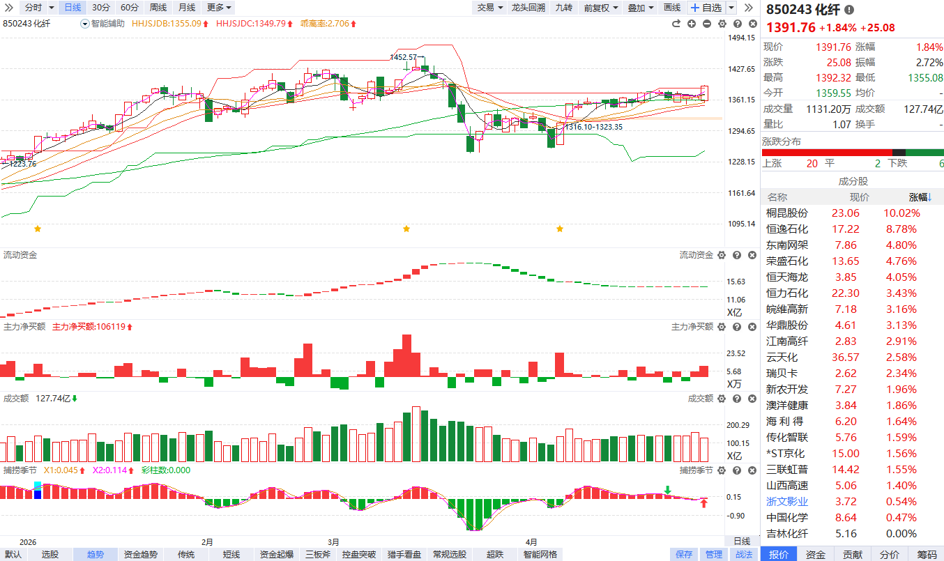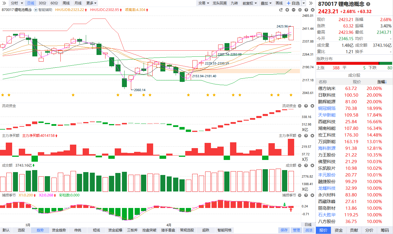 根据软件信号,板块近期流动资金持续翻红,主力净买额红肥绿瘦,目前熊线上移趋势启动,突破前期平台形成技术面转强信号。不过板块日内实体振幅较大,多为低开后量化抄底资金进场拉升,短线急涨后次日容易出现内部分化,注意回避高位追涨,耐心等待日线震荡2-3个交易日后的熊线再次上移节点。