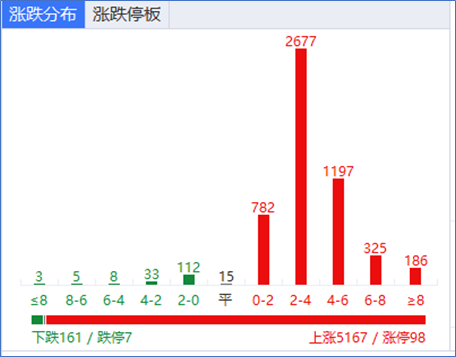 市场全天放量大涨,三大指数均涨超4%,沪指创2020年7月6日以来最大单日涨幅。沪深两市今日成交额9713亿,较上个交易日放量4203亿。总体上个股涨多跌少,全市场超5100只个股上涨。截至收盘,沪指涨4.15%,深成指涨4.36%,创业板指张5.54%。