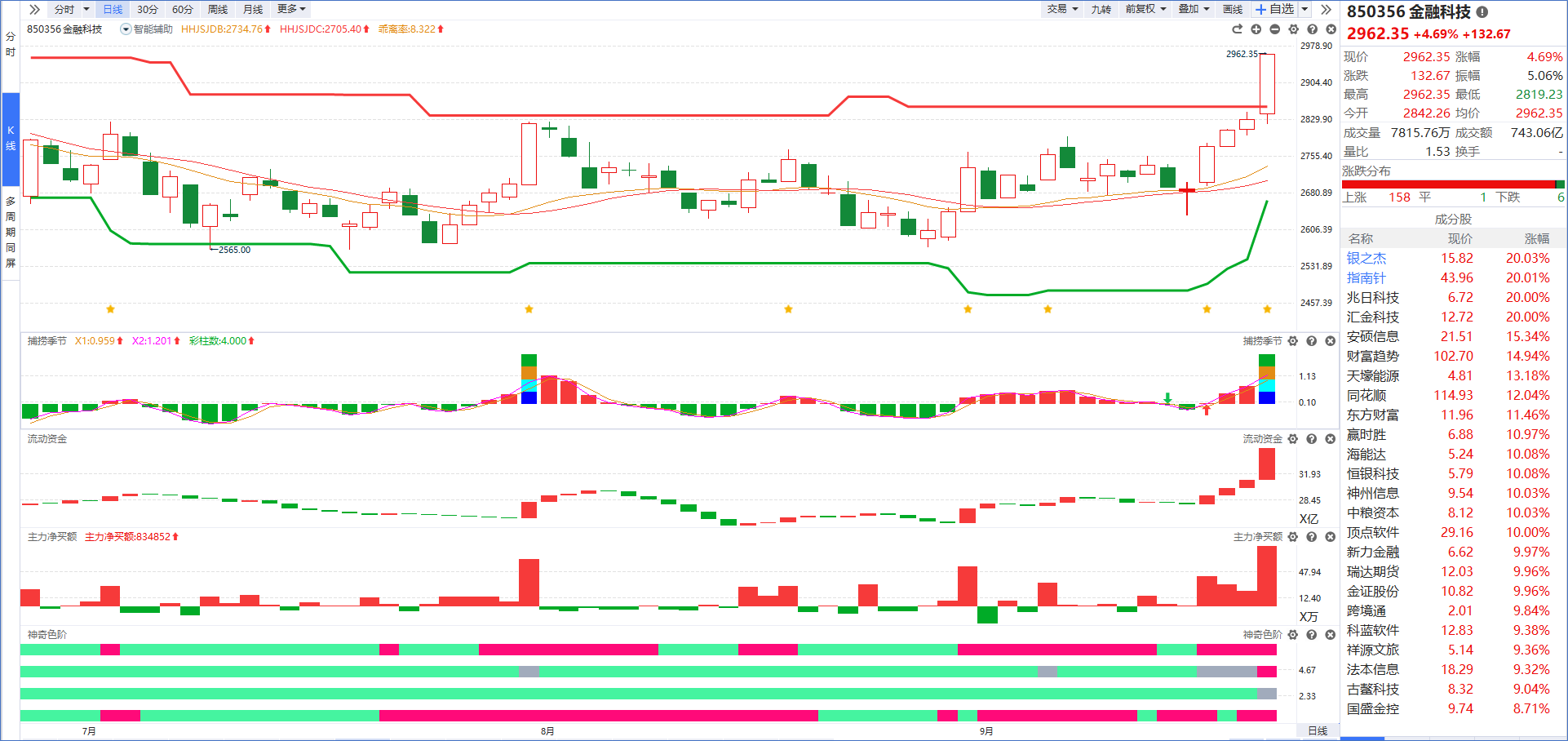 从软件指标来看,金融科技今天熊线上移+股价突破牛线说明该板块迎来突破机会,在主力净买额红肥绿瘦的情况下,随着主力资金持续流入有望迎来持续性的上涨行情,重点关注盘中出现“四线开花”的个股回档分时均线附近的低吸机会。