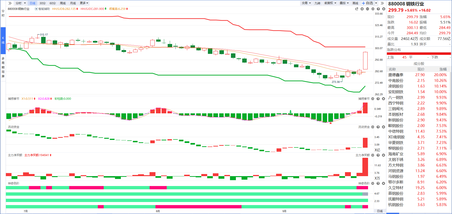 从软件指标来看,钢铁行业今天在政策利好刺激下强势突破智能辅助线,目前流动资金翻红+主力净买额红肥绿瘦说明有主力资金承接,但是板块题材太小后续爆发不足,谨慎观望为主。