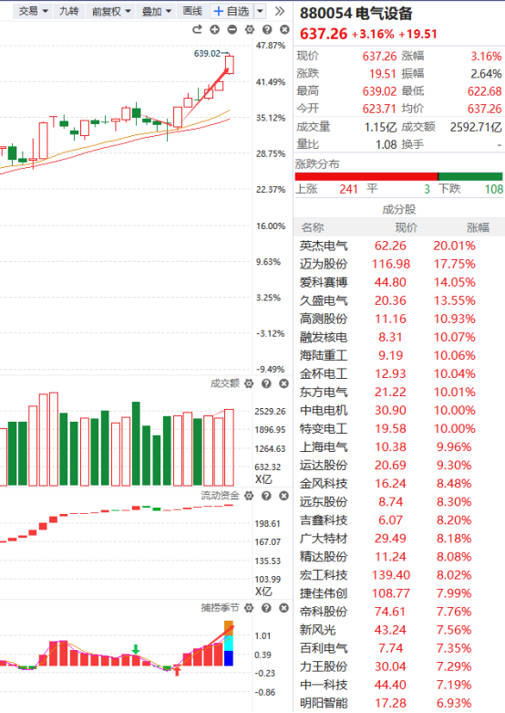 电气设备的走势非常好沿着智能辅助线慢慢爬升,成交量也保持得不错,流动资金持续翻红,捕捞季节呈强势金叉状态,可以继续保持跟踪。