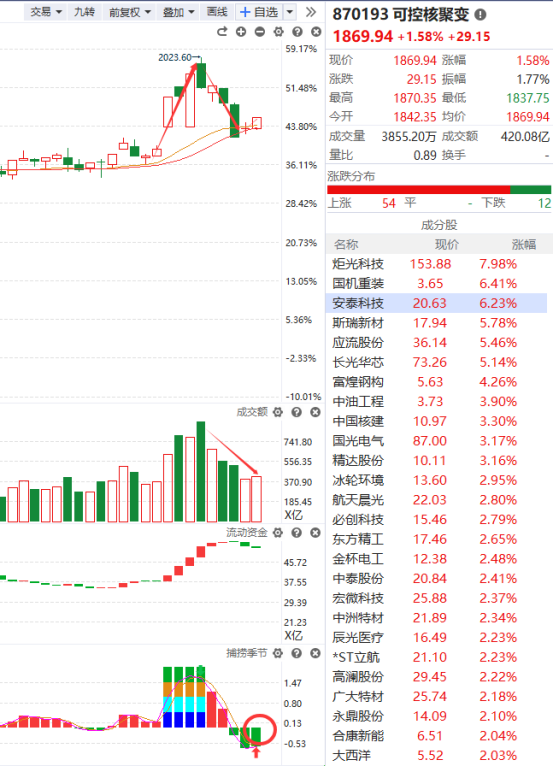 可控核聚变概念处于回档金叉初期的走势,目前它的趋势还比较弱,先看能否在智能辅助线得到支撑,能得到支撑后续上涨的可能性比较大,如果破位了则说明它今天的反弹只是因为有政策或消息的刺激,并没有得到资金的认可,跌破辅助线支撑则不做过多的关注。