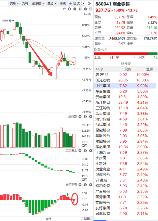 商业零售前期调整的幅度比较大,近期突破辅助线的压制上攻了一波随后又回落,虽然成交量跟流动资金指标并没有转好,但捕捞季节已经收出了金叉,可耐心等待它能否继续在辅助线上方企稳以及更多好转信号的出现,如若趋势有所好转则可以积极介入。