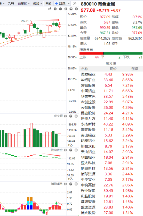 有色金属板块反弹过程中遇压回落,触及前期反弹高点时被打压下来,鉴于它的各项指标并不是很好,有可能会跌破辅助线的支撑,对该方向感兴趣的话可以先关注一下它是否会在近期破位,如果它能在智能辅助线上方企稳且各项指标开始好转则可以积极介入。