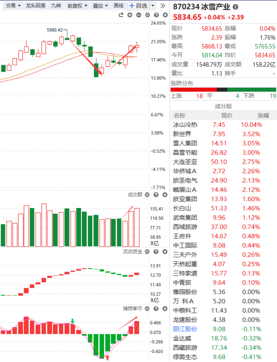 昨天指数放量上涨各大板块都迎来不同程度的反弹行情,有人可能会说冰雪产业的走势有点“胜之不武”,那么今天它再次低开高走,能在整个市场环境不好的背景下走出这样的走势,也算是证明了它的强势,不过随着时间的推移它在临近尾盘时突然跳水翻绿,这也给明天的走势埋下了不小的隐患,对该方向感兴趣的可以在调整时介入,千万别追高,毕竟现在市场的状态很不稳定。