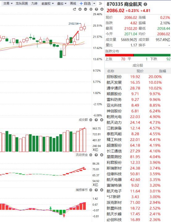 商业航天是为数不多有话题度有政策支持的方向之一,而且近期它的走势很强,各项指标都呈现比较健康的状态,流动资金持续翻红,捕捞季节收出金叉,成交量也维持得不错,不过需要注意一点的是,昨天的跳空高开让它收出历史新高,今天盘中没有突破前高,而且又鉴于它近期的走势不错以及市场情绪的不稳定,持有相关个股的继续拿着就行了,没有持有的千万别追高买入。