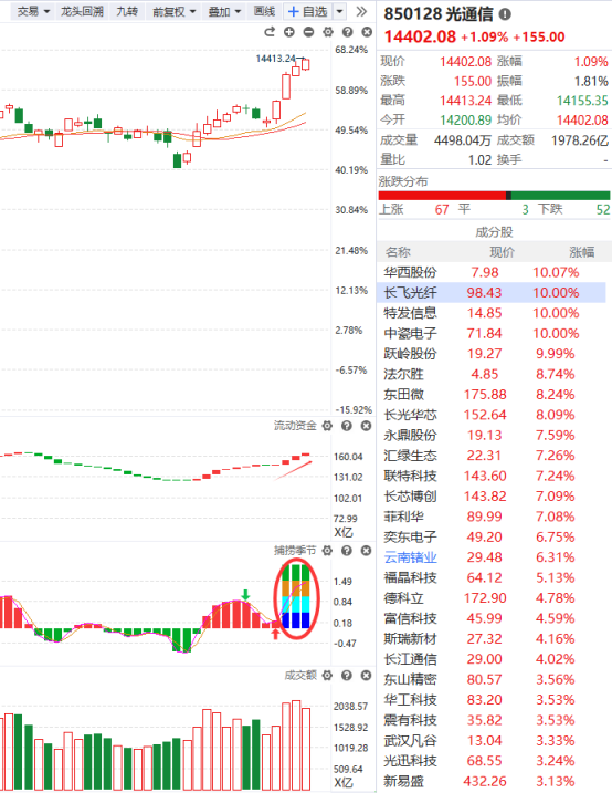 光通信近期的走势非常强,能在指数震荡的大背景下创出历史新高,就这种魄力而言当下没有哪个板块可以与之相媲美,流动资金连续三天以上翻红,说明资金比较认可该板块的走势,但成交量的缩量以及连续三天收出光头彩也给它后续的上涨埋下了隐患,在该方向已经赚到钱的不妨先落袋为安一部分,留个底仓,主要就是为了博弈后面的拉升行情,当然这种可能性比较小,但不意味着不可能,留个底仓,即使后续调整了也不至于面临较大的亏损。