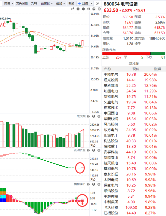 电气设备在智能辅助线上方企稳,成交量呈持续放量状态,流动资金连续两天翻红,捕捞季节刚刚收出金叉,从技术指标来看属于上涨行情初期的状态,但在市场这种环境下来说,指标容易失真,有仓位继续拿着,跌破辅助线支撑离场,越是在这个时候越不能乱动,以不变应万变。