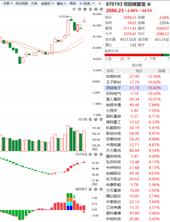 今日,早盘可控核聚变大幅高开,王子新材涨停,常辅股份高开超10%,爱科赛博、哈焊华通、雪人集团、中洲特材涨幅靠前。