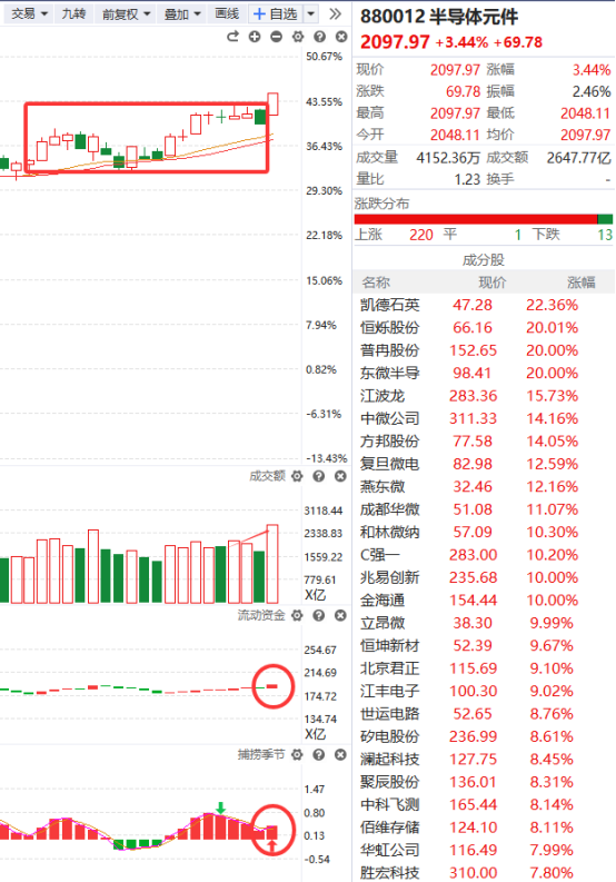 半导体元件板块脱离窄幅震荡区域,今天迎来大幅上涨,成交量呈放量状态,流动资金开始翻红,捕捞季节收出金叉,该板块所处的位置并不高,再加上市场情绪开始好转,那么前期表现不是特别强的方向有望迎来补涨行情,持有该方向个股的继续持股待涨即可。