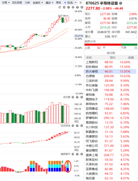 有色金属不受市场调整的影响继续上涨并创出新高,这主要得益于它的避险属性,但任何方向都不可能无止境地上涨,况且它在盘中冲高回落并收出了一个长上影线,现在就怕它无法持续住涨势从而走出“补跌”行情,对该方向感兴趣的可以关注其回踩智能辅助线后出现金叉的二次介入时机。