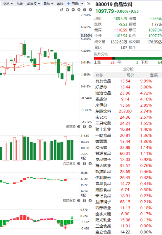 食品饮料只是局部个股异动,整个板块其实表现得并不是很好,它仍被辅助线牢牢压制,各项指标都没有出现好转的迹象况且市场的情绪也比较低迷,它“一日游”的概率继续,K线没有站上辅助线以及各项指标未出现明显好转信号时不做过多的关注。