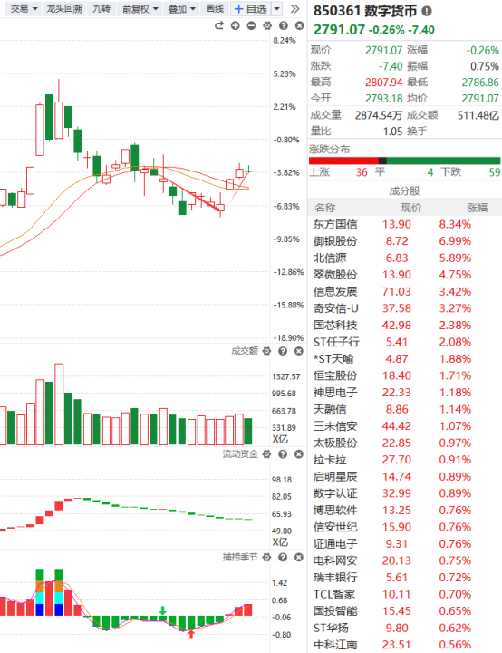 数字货币牌照的申请,对该板块而言是极大正向刺激,也有利于推动该板块的上涨,只是它目前所处的趋势不算特别强,而且指标方向也是好坏参半的,既有捕捞季节收出金叉又有流动资金翻绿以及成交额缩量,继续保持观望吧。