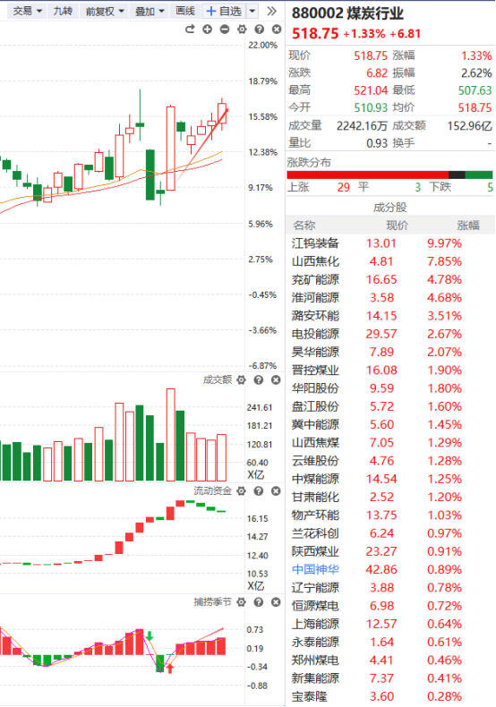 煤炭板块虽然近期没有走出特别持续的强势上涨行情,但它的持续震荡小幅上涨行情却给人留下了深刻的印象,在指数都不能保证连阳的状态,它却做到了,不过它同样面临前期反弹高点压力位的影响,就不知道它能否在年前保持持续上涨的状态并强势突破,对于那些实在没有什么好选的方向又想安安稳稳过个年的投资者而言,布局这些方向或许是一个不错的选择。