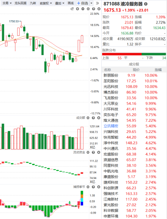 液冷服务器概念在今天市场情绪整体有所降温的背景下,还保持较为强势的上涨行情,这是非常难得的,目前它的趋势没有问题,流动资金持续翻红,但是捕捞季节收出了光头彩柱,现在比较担心的就是它在市场走弱的情况下逆市上涨,后续一旦龙头崩了,那是否会使得整个板块迎来补跌行情,在该方向已经赚到钱且仓位比较重的,可以适当降低一些仓位。