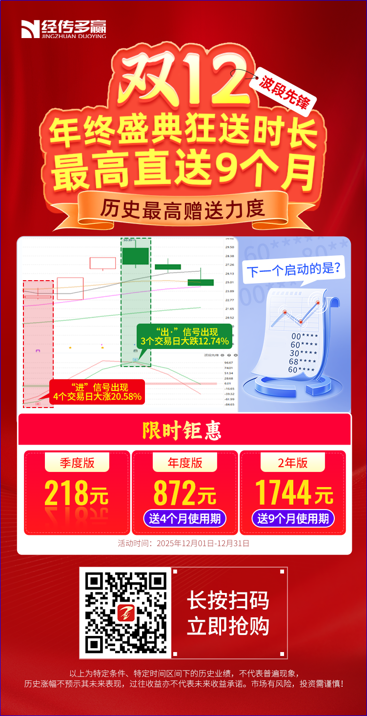 还在为短线操作踏不准节奏烦恼?现在,帮你把控买卖时机的【波段先锋】双12年终福利重磅来袭--不加套路只加时长,用更长的工具使用权,陪你在行情轮动中捕捉每一次波段机会!