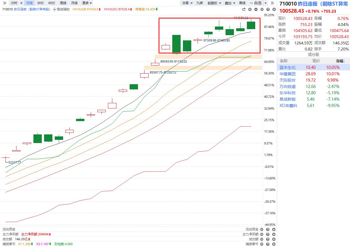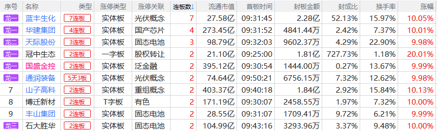 焦点股方面,蓝丰生化晋级7连板,低价叠加芯片概念的山子高科13天8板,上海微电子概念股华建集团14天8板,有色金属板块全天强势,其中精艺股份5天4板、博迁新材2连板。