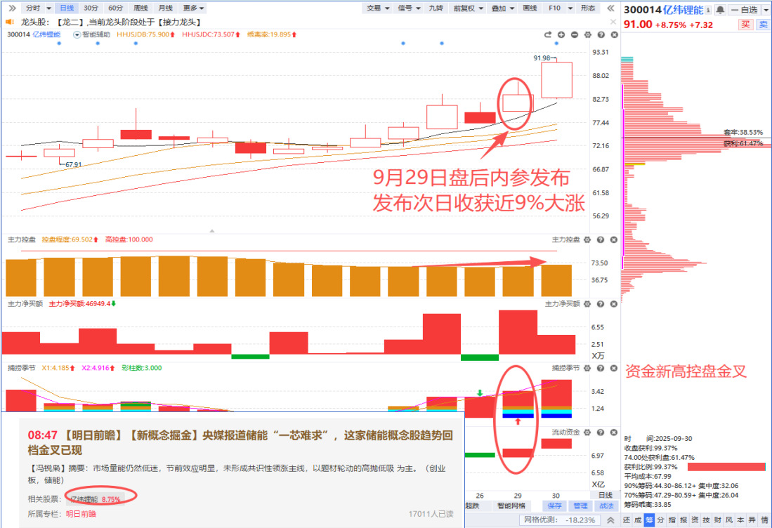 市场缩量反弹,《明日前瞻》栏目紧跟指数节奏!9月29日盘后内参出击锂电池概念股亿纬锂能,发布次日收获近9%的大阳线上涨!让跟上节奏的朋友收获节前红包!