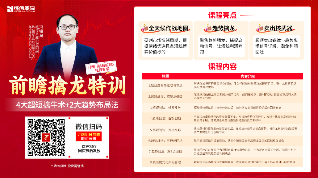 题材快速轮动,节后如何布局?《明日前瞻》栏目以深度市场研究为根基,用专业视角拆解热点逻辑,帮你在复杂行情中找准主线、锁定潜力标的!国庆特惠附赠4大超短擒牛术+两大趋势布局法系列课程!