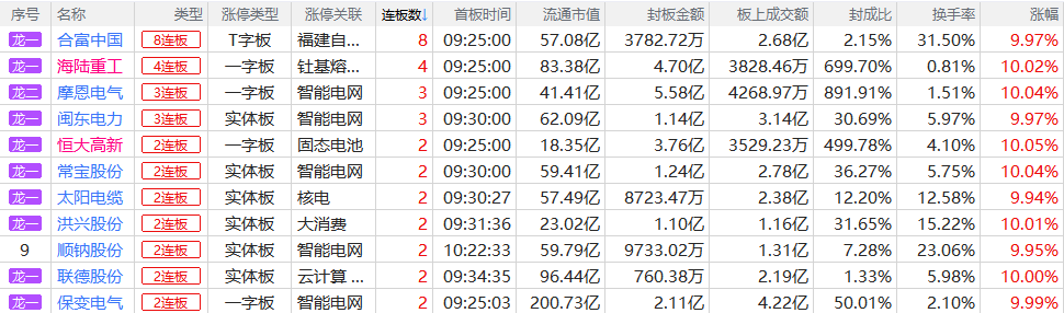 焦点股方面,合富中国放量涨停走出8连板,参与钍基熔盐实验堆的海陆重工一字涨停晋级4连板,铬盐龙头振华股份7天4板,电网设备叠加AMC概念的摩恩电气3连板。