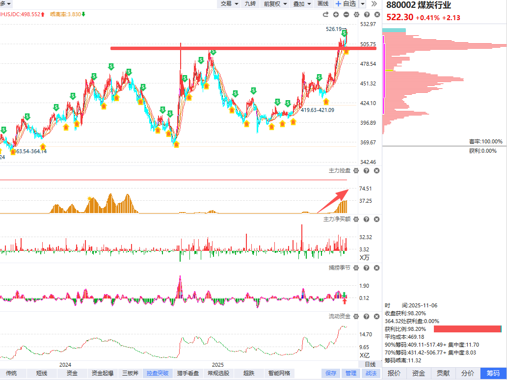 另外趋势方向除了机构重仓的大科技、新能源以外,GJD重仓的高股息(银行、煤炭、石油、电力等)也是重要方向之一,煤炭最近期货主连维持上涨,四季度也有“冬炒煤”的传统,板块控盘和资金增加突破历史新高,有机会走一波趋势行情,也可以持续关注。