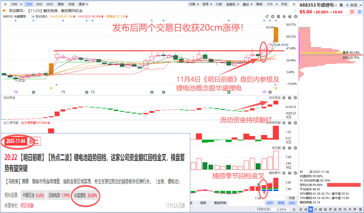 市场连续阳线反弹,恭喜《明日前瞻》栏目顺势擒牛!11月4日盘后内参提及锂电池概念股华盛锂电,发布后仅2个交易日就斩获20cm涨停,让跟上策略的朋友成功吃肉!