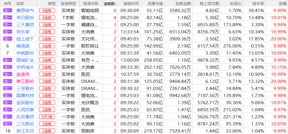 焦点股方面,合富中国走出11天10板,摩恩电气晋级6连板,锂电池板块延续强势,孚日股份4连板、国城矿业2连板、永太科技3天2板。