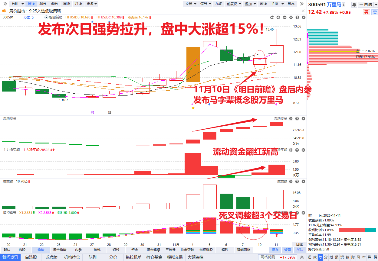11月10日盘后内参发布马字辈概念万里马,发布次日强势拉升盘中大涨超15%!