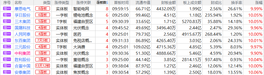 焦点股方面,合富中国继续缩量涨停走出13天12板,摩恩电气将连板高度拓展至8连板。玄学炒作火热,简称带有美好寓意的安泰集团21天12板,“三字辈”三木集团9天6板,“马字辈”海马汽车10天6板。