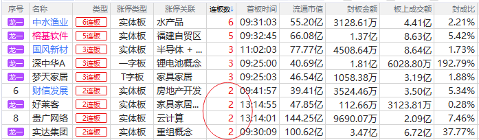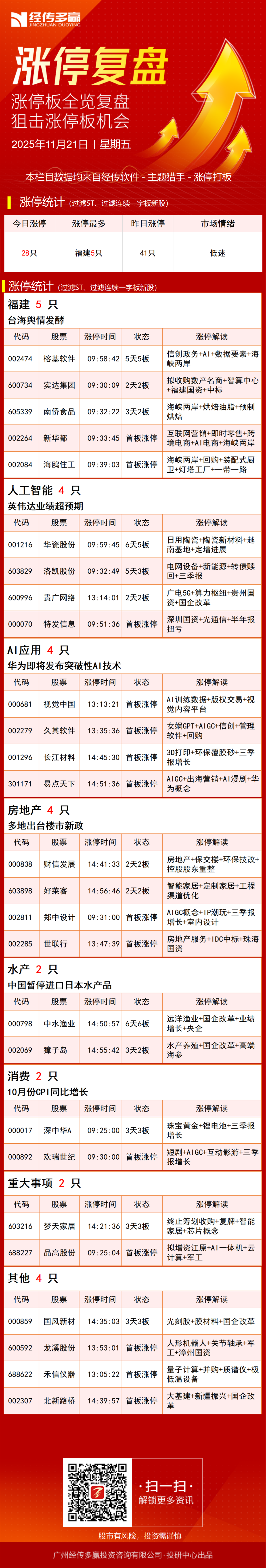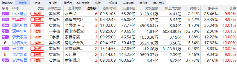 焦点股方面,水产股中水渔业6连板、獐子岛3天2板,AI应用概念股榕基软件5连板、实达集团2连板,华瓷股份上演“准地天”行情走出6天5板。