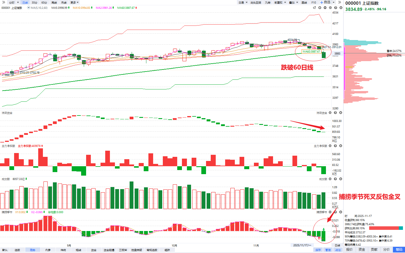 指数角度,上证已经跌破60日线这一中期趋势生命线,且为比较恶劣的竞价跳空低开破位,捕捞季节死叉反包金叉,技术性指标全面走弱,意味着需要一次比较大的洗牌了。这种大级别的指数分歧,要么用时间消化,连续小阴小阳震荡直到再次形成周线金叉;要么用空间消化,短期形成一波上证下探熊线支撑、平均股价/创业板指等弹性指数跌破熊线支撑后深V反转的超跌反弹结构。