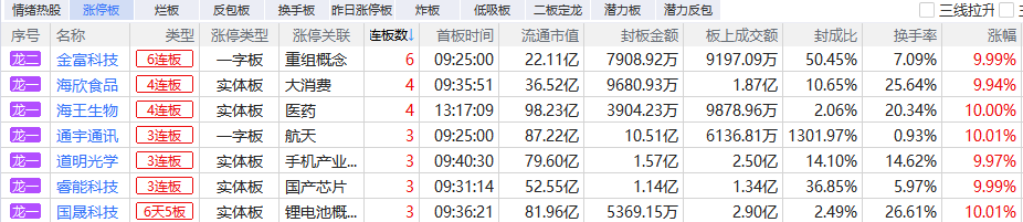 焦点股方面,并购重组的国晟科技16天11板、金富科技6连板,商业航天概念股航天发展12天8板、雷科防务6天5板,福建本地股实达集团8天6板,光刻胶概念股国风新材9天5板。