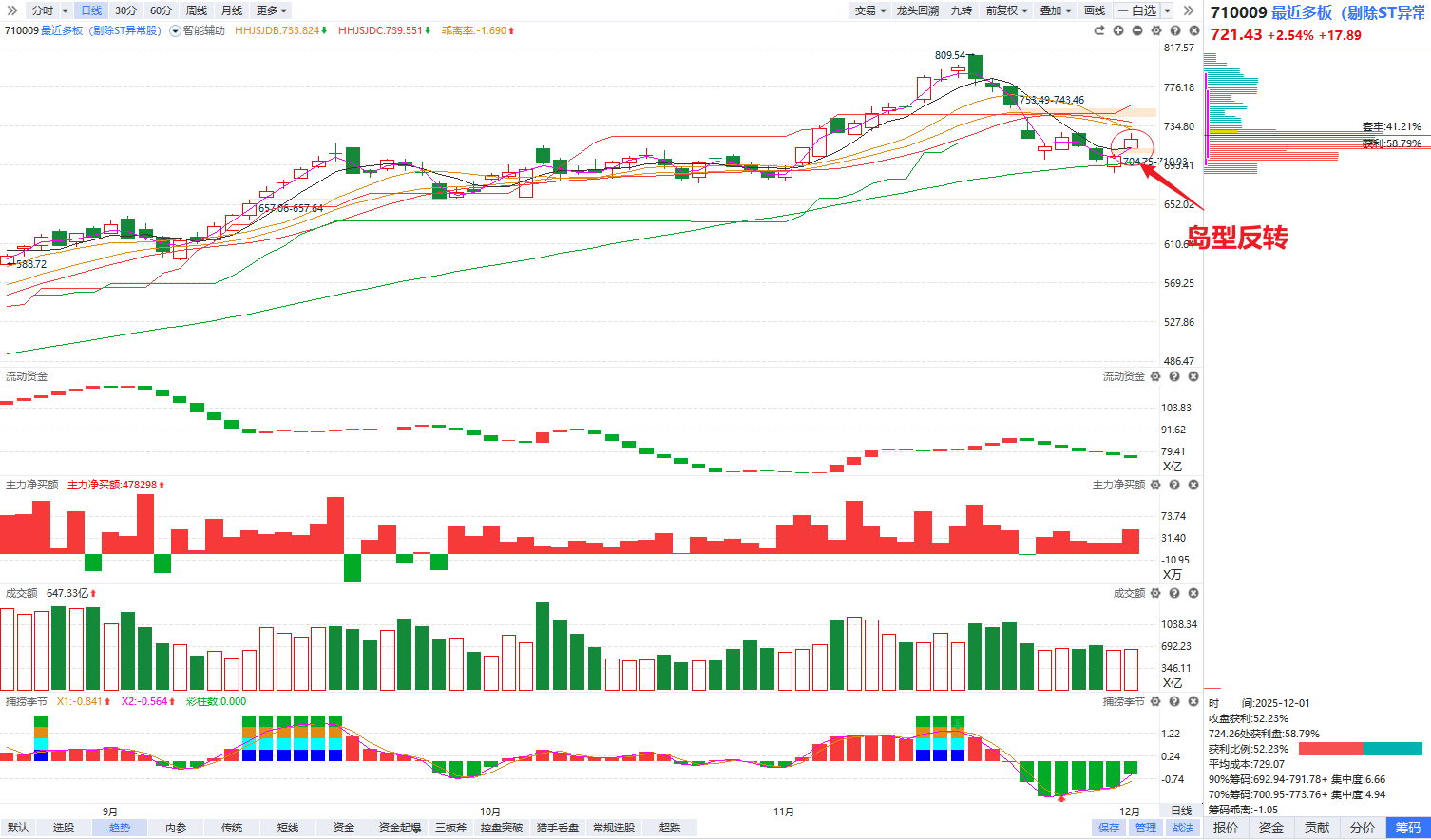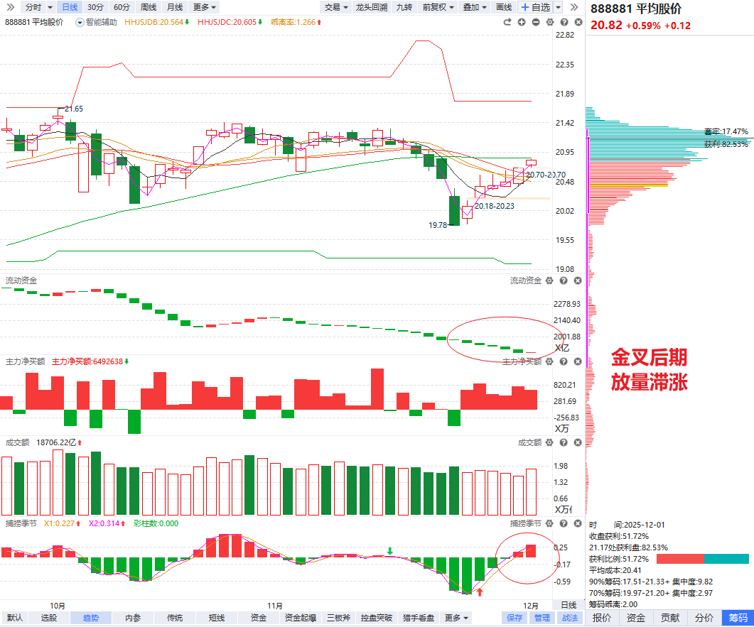 多板指数在11月底经历过一轮媲美3月底的惨烈杀跌以后,走出跳空高开收阳的岛型反转形态。多板指数企稳了60日线,就意味着金富科技断板以后的新周期,赚钱效应大概率会非常强,短期小仓位过渡就好,分清孰轻孰重,把精力和重心都放在新周期主升节点的启动上。