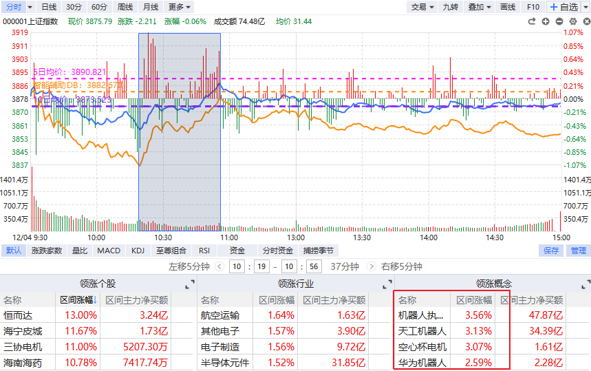 如果市场要由日内止跌震荡转为趋势走强,需要几个条件:指数回升、市场放量、共振题材持续走强。从软件复盘来看,早上平均股价回升时,共振的主要是机器人板块,发酵了特朗普“带货”以及特斯拉隔夜大涨的消息。不过早上10:30左右开始的这一波拉升也没放出多少量,而且机器人本身也是超跌轮动的板块,量能强度和板块属性都不是太好,所以想要进一步走强带动指数反攻还是有一点难度的。