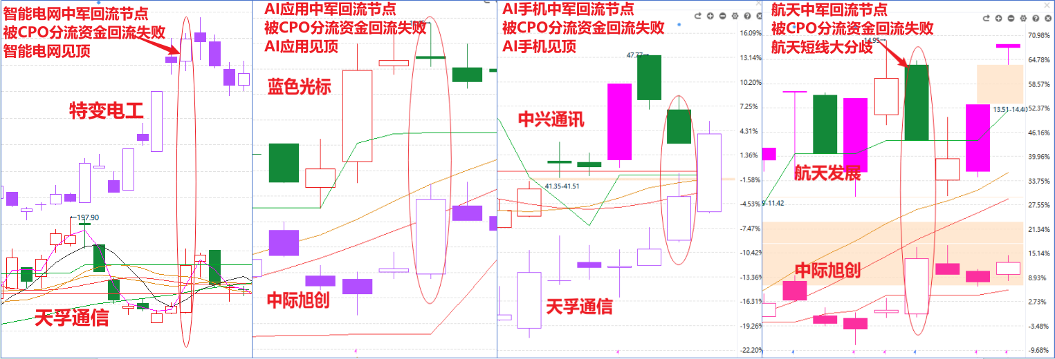 另外早上机器人拉升的时候CPO的大票有一起动,也是个隐患。最近基本每个想跟指数共振的新方向,最后都会被光模块卡死流动性然后走不出来,因为光模块大票虹吸效应太强,导致题材的中军基本很难走出回档反弹,比如智能电网中军特变电工(11月5日共振指数11月7日尝试回流)、AI应用中军蓝色光标(11月24日共振指数11月26日尝试回流)、AI手机中军中兴通讯(12月1日共振指数12月3日尝试回流),航天也一样因为中军航天发展(11月24日共振指数11月26日尝试回流)被光模块抽血导致板块集体大跌。可见只要是想不开想跟指数走共振的,最后都会被光模块干没。所以最近市场只有两种方向:逆指数抱团的方向和光模块,因为只要创业板指数一涨,光模块几个大票就会把新生题材的资金全部抽走。
