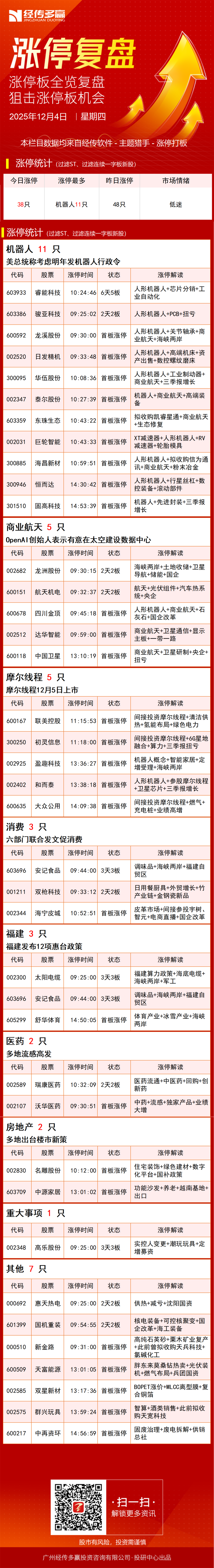 今日共38股涨停,连板股总数10只,其中三连板及以上个股3只,上一交易日共11只连板股,连板股晋级率27%;26股封板未遂,封板率为59%。